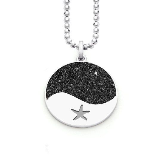 Runder Anhänger mit einer Welle und Seestern, zur Hälfte eingebettet in Lavasand und gefasst in rhodiniertem poliertem 925er Sterling-Silber.