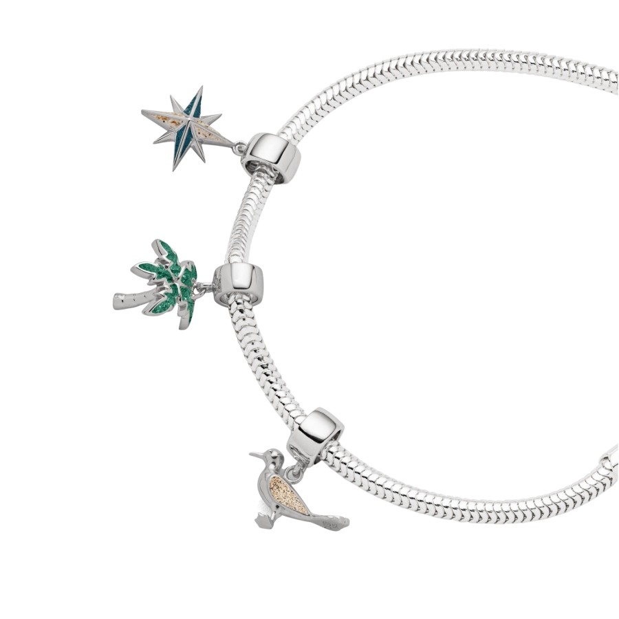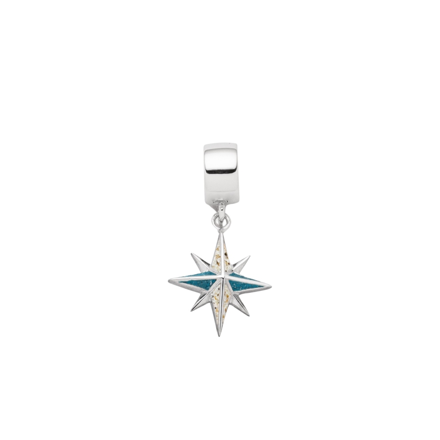 Charm in Form einer Kompassrose, teilweise gefüllt mit blauem Steinsand, alles aus poliertem und rhodiniertem 925er Sterling-Silber.