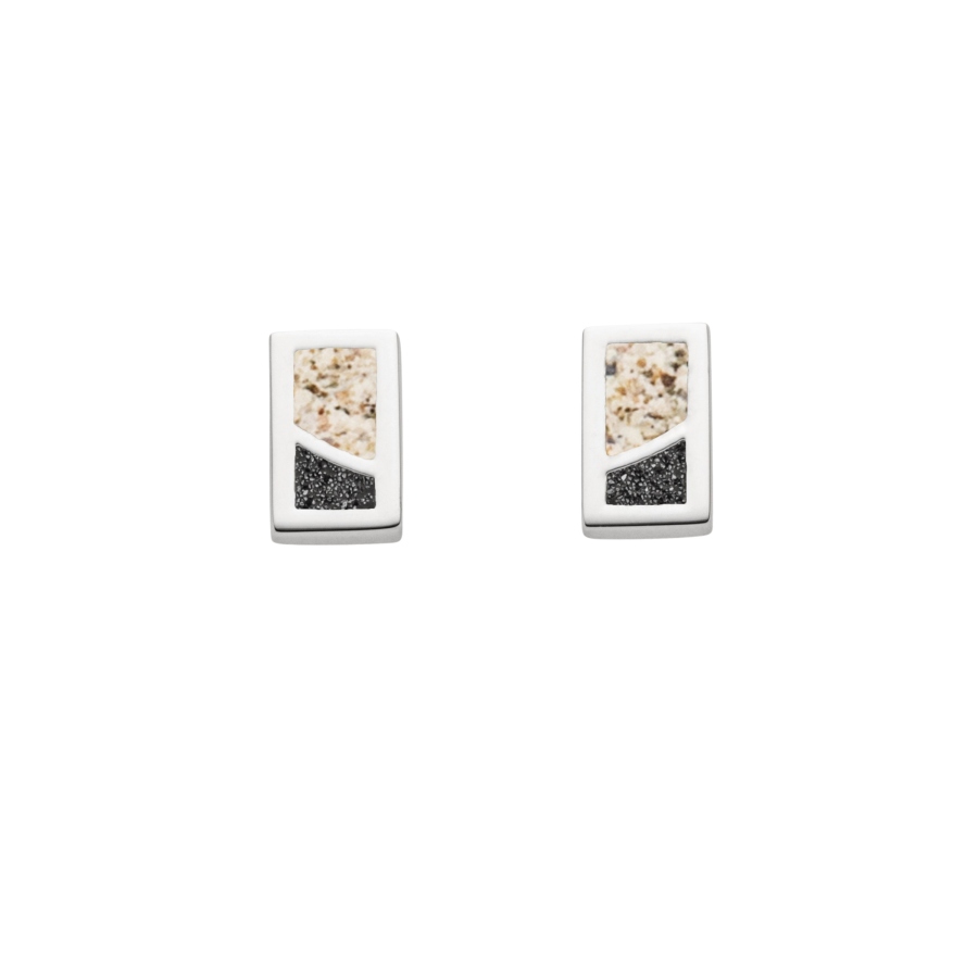 Eckiger Ohrstecker "Duett" mit zweierlei Füllung aus Strandsand und Lavasand, getrennt durch eine feine Silberlinie, alles gefaßt in rhodiniertem 925er Sterlingsilber.